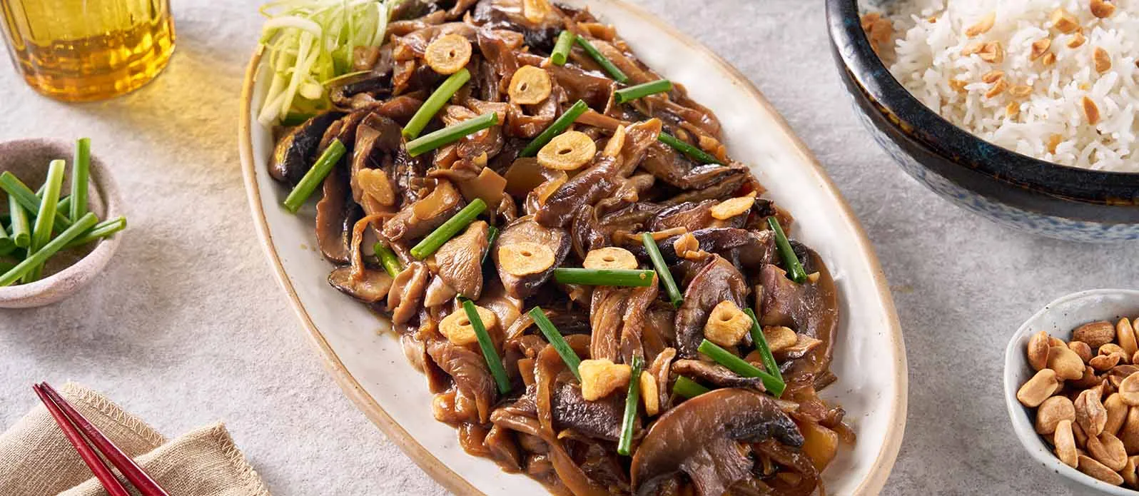 Sirva la salsa de setas caliente sobre el arroz y espolvoree con la cebolleta y el ajo frito.