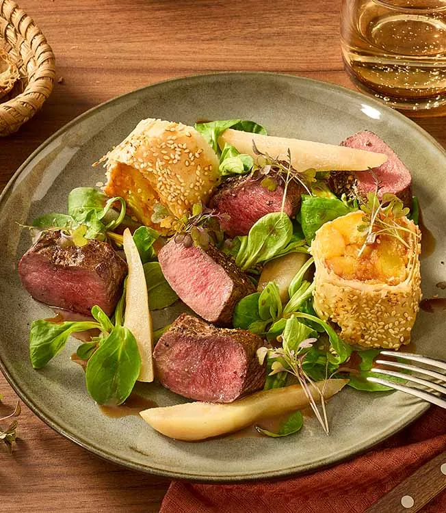 Corte el strudel en porciones y el ciervo en medallones. Disponga la ensalada de canónigos y las peras en los platos, rocíe con la vinagreta y coloque encima la carne y el strudel. Decore con berro rojo si lo desea.