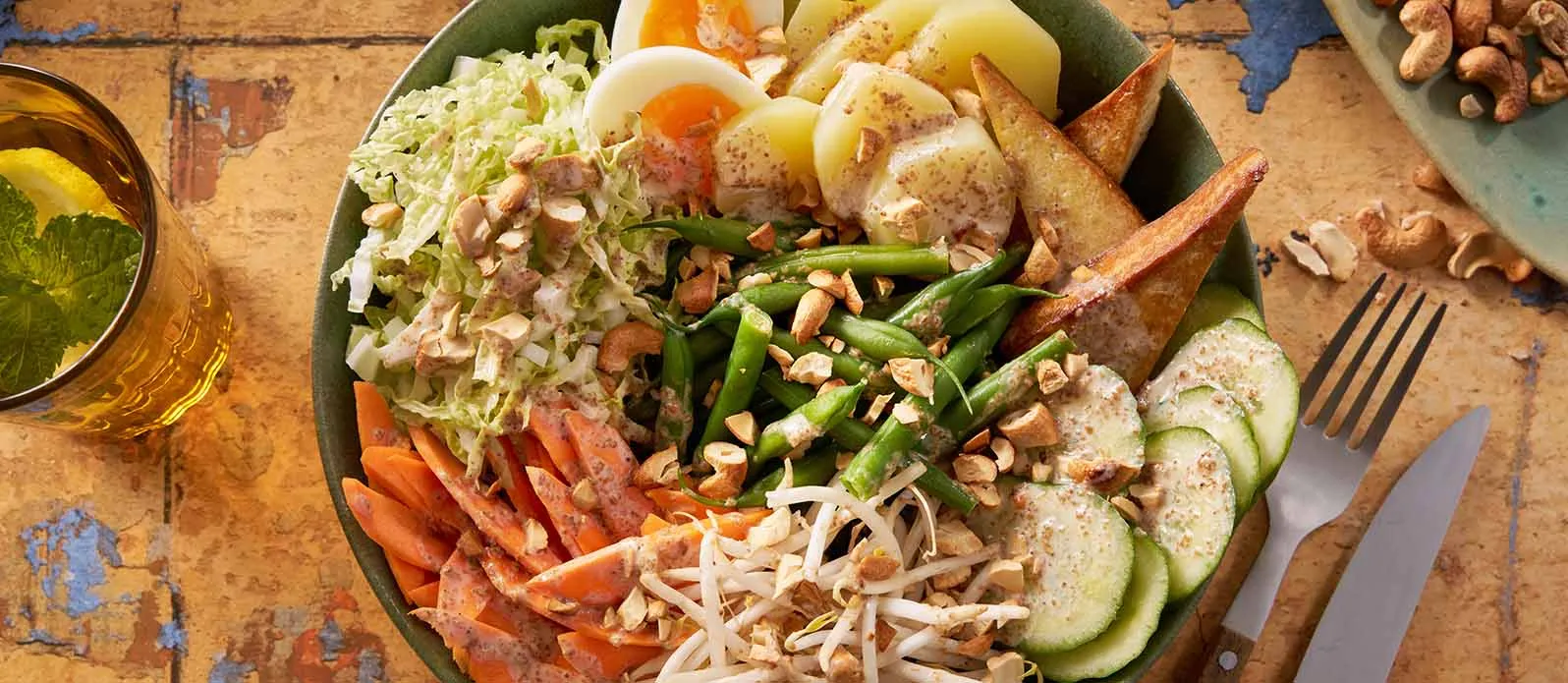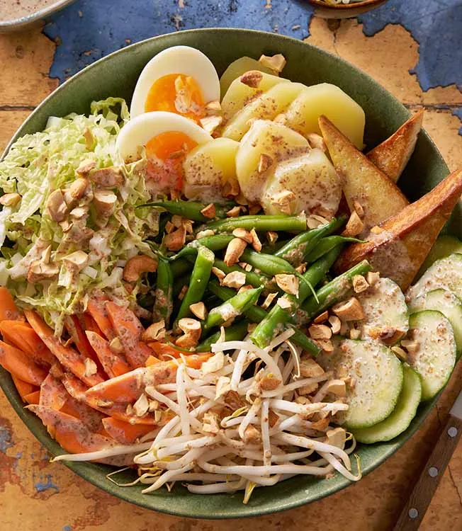 Ensalada gado-gado de Indonesia, rociada con la aromática Salsa de Sésamo Kikkoman. Los frutos secos aportan un toque crujiente y un carácter distintivo.