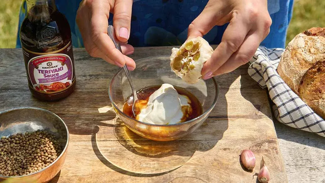 Precaliente el horno a 200 °C. Corte la parte superior del bulbo de ajo y rocíelo con el aceite de oliva y una pizca de sal. Envuélvalo en papel de aluminio y áselo durante 30-40 minutos hasta que quede dorado y blando. Una vez fríos, exprima y machaque los ajos. Mézclelos con la Salsa Teriyaki con ajo Kikkoman y el yogur griego.