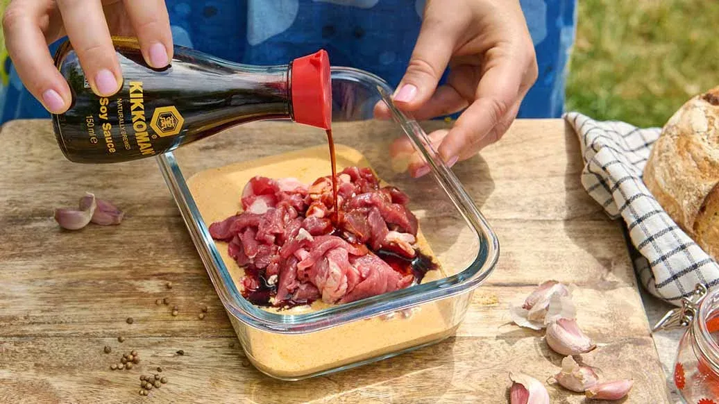 200 g de paletilla de cordero en lonchas finas – 2 dientes de ajo picados – 2 cucharadas de yogur natural – 1 cucharada de zumo de limón – 1 cucharada de aceite de oliva – 1 cucharadita de comino molido – 1 cucharadita de pimentón en polvo – ½ cucharadita de cilantro molido – ½ cucharadita de canela molida – 4 cucharadas Kikkoman Salsa de Soja naturalmente fermentada