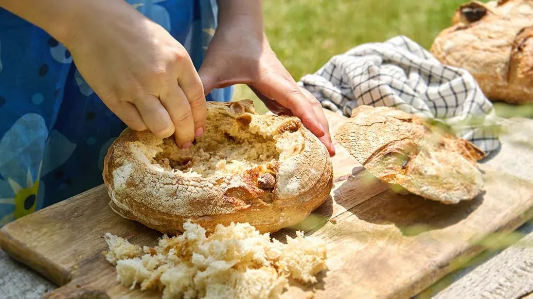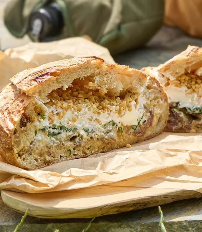 Este pan de picnic combina shawarma de cordero marinado, espinacas y frutos secos en un pan crujiente, cubierto con salsa de ajo asado. Perfecto para picnics o reuniones, es una comida deliciosa y fácil de transportar.