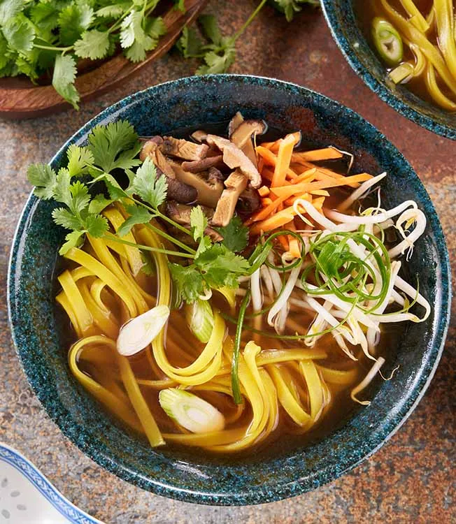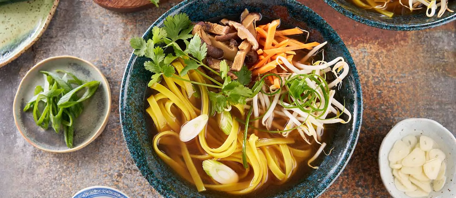 Un pho vegetariano fragante con tofu, setas shiitake y verduras frescas, elaborado con un caldo perfumado de anís estrellado, cardamomo y jengibre. Una receta ligera y equilibrada, rica en umami con la Salsa de Soja Tamari sin gluten Naturalmente Fermentada Kikkoman.