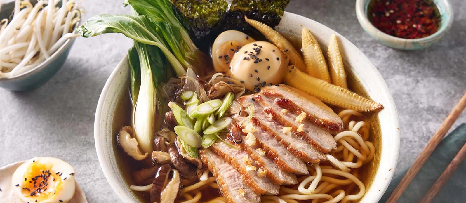 Cueza los fideos de ramen por separado siguiendo las instrucciones del paquete. Marque la piel de las pechugas de pato en forma de rejilla. Coloque el pato con la piel hacia abajo en una sartén fría y deje que la grasa se funda lentamente a fuego suave. Dórelo por el lado de la piel durante unos 6 minutos, dele la vuelta y cocine 2 minutos más. Pase al horno y termine la cocción a 160 °C con calor arriba y abajo durante 8–10 minutos. Deje reposar brevemente y córtelo en láminas.