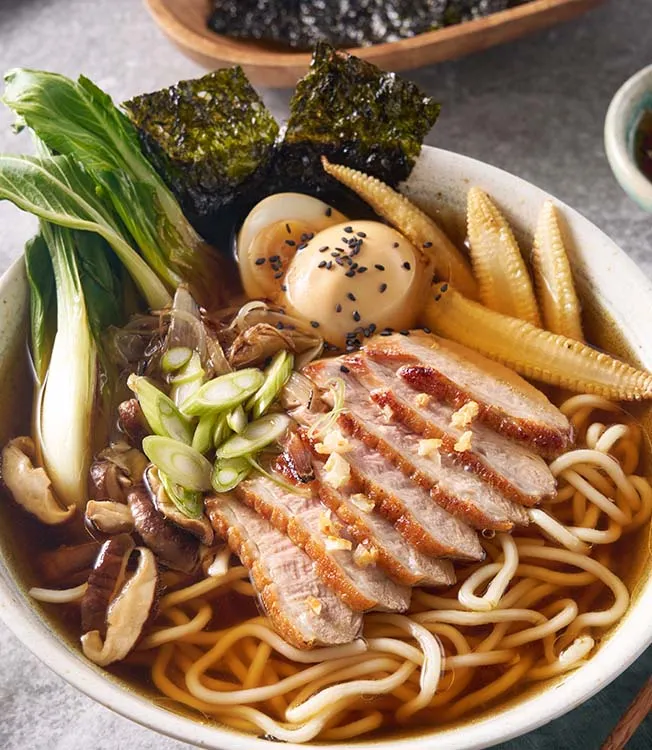 Este ramen shoyu aromático combina finas lonchas de pato tierno con un caldo rico y lleno de sabor, elaborado con jengibre, ajo y Salsa de Soja Naturalmente Fermentada Kikkoman. Un plato saciante y delicioso que destaca por su profundidad umami y su carácter reconfortante.