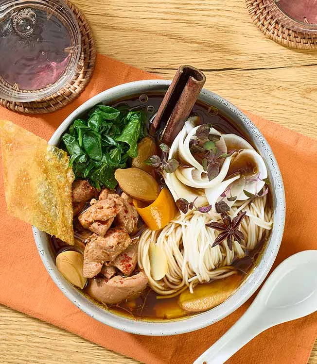 Mientras se cocina el caldo, cueza los fideos de arroz según las instrucciones del paquete. Escalde las espinacas brevemente, marínelas con el Aceite de Sésamo Tostado Kikkoman y dispóngalas en porciones de unos 50 g. Mezcle suavemente el rábano con el Sazonador para arroz de sushi Kikkoman, deje marinar unos minutos y forme nidos de aproximadamente 60 g.