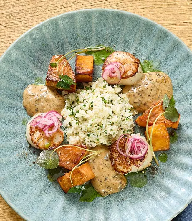 Vieiras salteadas acompañadas de cuscús de coliflor y almendra, boniatos asados y un sabayón de nori. La Salsa de Soja con menos sal Naturalmente Fermentada Kikkoman y el Sazonador para arroz de sushi Kikkoman armonizan el conjunto y aportan un perfil de sabor intenso y equilibrado.