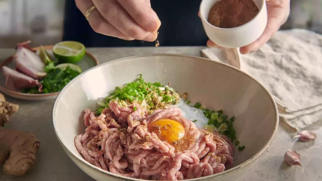 Añada la carne picada, el huevo y el resto de especias y hierbas al bol con los fideos y las verduras. Mezcle bien. Forme bolas con la mezcla de carne de unos 3-4 cm de diámetro.