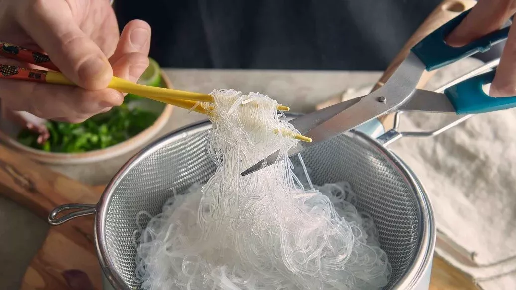 Cueza los fideos de cristal siguiendo las instrucciones del paquete, después enjuáguelos con agua fría y córtelos en trozos más pequeños con unas tijeras. Colóquelos en un bol.