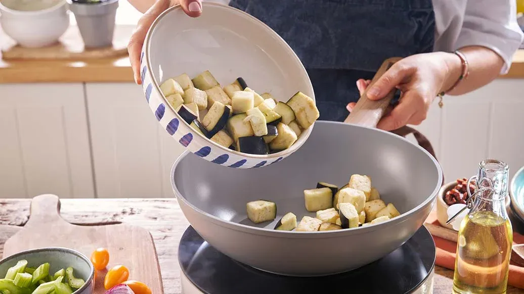 Este salteado rebosa de sabores mediterráneos: la intensidad de la berenjena, la dulzura del tomate seco y el frescor de la albahaca, unidos por el umami de la Salsa de Soja Naturalmente Fermentada Kikkoman.