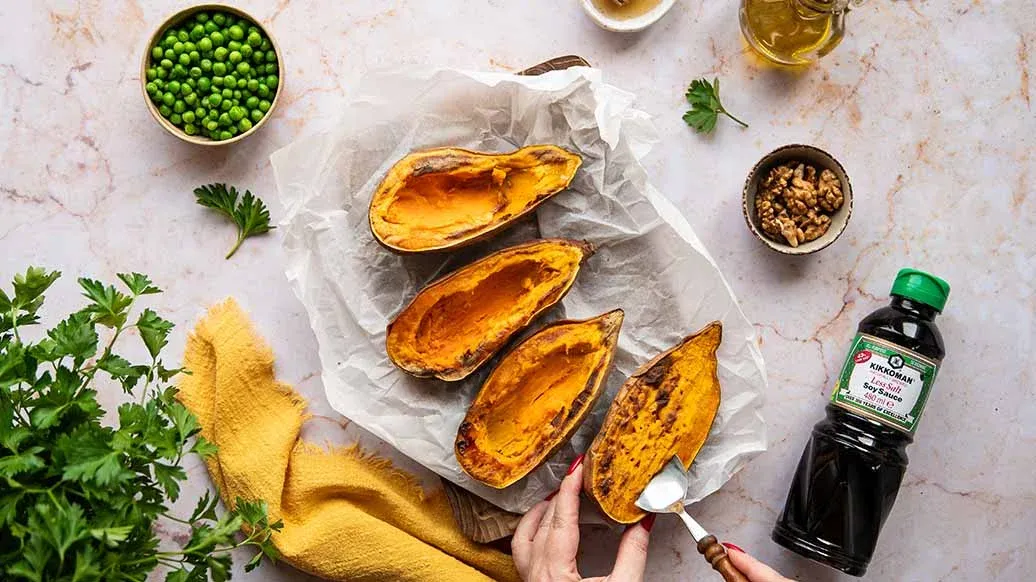 Boniatos horneados y rellenos con una mezcla de quinoa, kale y guisantes, acompañados de una salsa de yogur con miel y soja, y coronados con nueces. Una propuesta nutritiva y llena de matices, realzada por la Salsa de Soja con menos sal Naturalmente Fermentada Kikkoman.