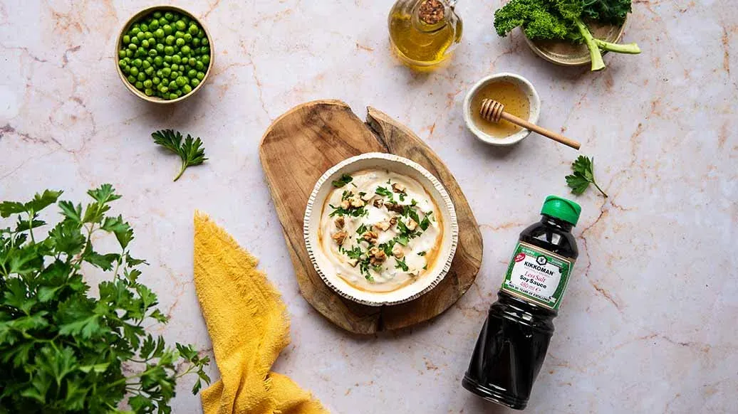 4 cucharadas de yogur griego – 1 cucharada Kikkoman Salsa De Soja con menos sal naturalmente fermentada – 2 cucharaditas de miel – 15 g de nueces picadas – ½ cucharada de perejil picado