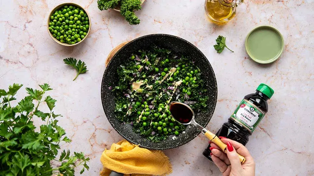 40 g de cebolla morada – 30 g de kale – 2 cucharadas de aceite de oliva – 40 g de guisantes congelados – ½ cucharada de tahini – 2 cucharadas Kikkoman Salsa De Soja con menos sal naturalmente fermentada – 1 cucharada de agua – 140 g de quinoa cocida – 100 g de queso feta
