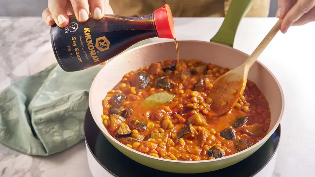 Un reconfortante chana dal cocido lentamente con berenjena y ajo asado, realzado con una mezcla de especias ahumadas y profundas, y la intensidad equilibrada de la Salsa de Soja Naturalmente Fermentada Kikkoman. Ideal para acompañar con naan de ajo recién horneado y hojas de cilantro fresco.