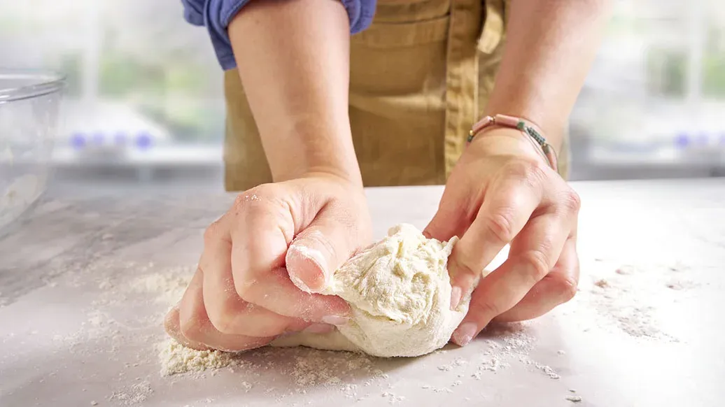 200 g de harina de trigo – 20 g de harina adicional para espolvorear – ½ cucharadita de levadura química – ½ cucharadita de bicarbonato de sodio – 40 ml de leche templada – 75 g de yogur natural