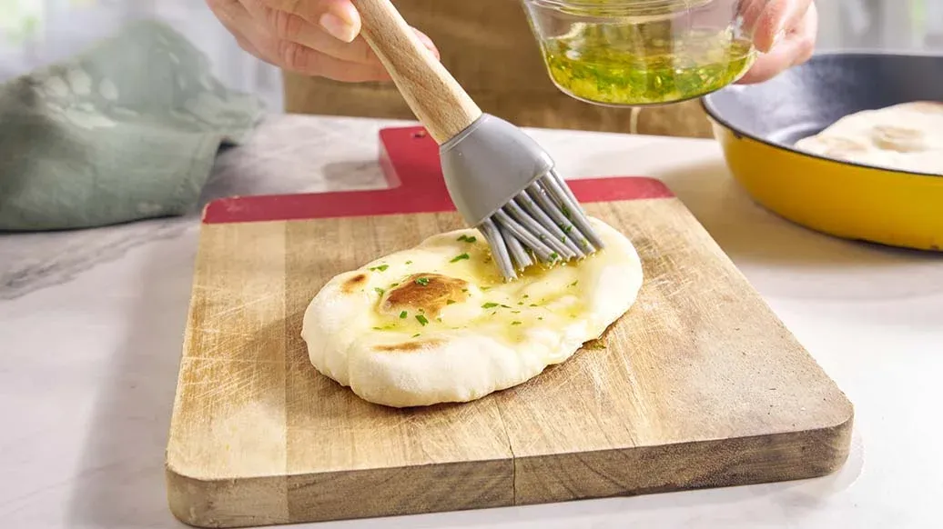 En un cuenco grande, mezcle 200 g de harina con la levadura química y el bicarbonato de sodio. Incorpore poco a poco la leche templada, removiendo hasta formar una masa, y luego añada el yogur. Amase durante 5 minutos, hasta obtener una textura lisa y elástica. Cubra con un paño húmedo o film transparente y deje reposar en un lugar cálido durante unos 20 minutos. Divida la masa en cuatro porciones y estire cada una formando un pan plano ovalado de unos 3–4 mm de grosor, espolvoreando con los 20 g de harina restantes.