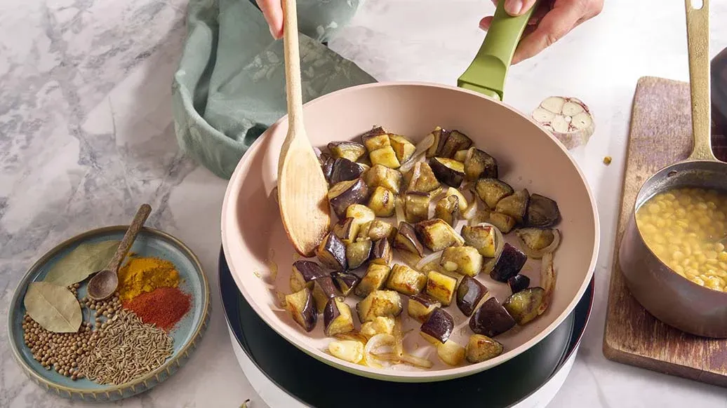 Corte la parte superior de la cabeza de ajo para dejar los dientes al descubierto. Úntela con el aceite y hornéela durante unos 30 minutos (180°C). Cueza el chana dal en el caldo de verduras durante 40 minutos. En una sartén, saltee la cebolla y la berenjena con el ghee durante 5 minutos, hasta que estén doradas. Incorpore el ajo asado presionando suavemente los dientes para extraer la pulpa. Añada el comino, la cúrcuma, las semillas de cilantro, el pimentón ahumado y la hoja de laurel, y fría durante 10–15 segundos para que liberen su aroma.