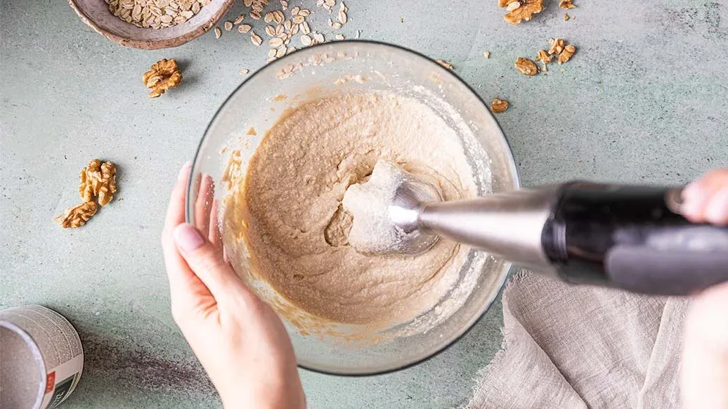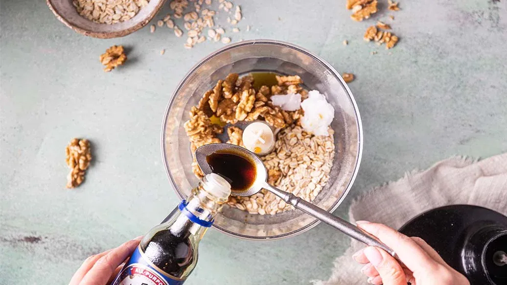 Triture las nueces y la avena junto con el sirope de arce, el aceite de coco y la Salsa de Soja Tamari sin gluten Naturalmente Fermentada Kikkoman hasta obtener una mezcla pegajosa.