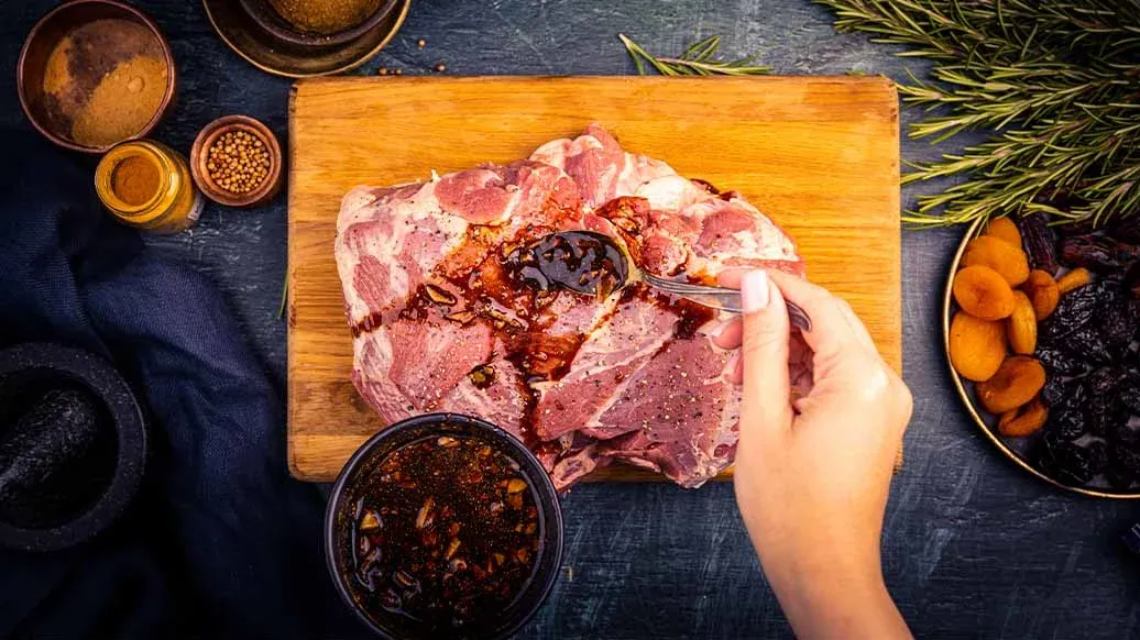 2 cucharadas Kikkoman Salsa de Soja naturalmente fermentada – 1 diente de ajo finamente picado – 1 cucharadita de pimienta negra recién molida – ½ cucharadita de jengibre molido – ½ cucharadita de comino molido – 1 cucharadita de cúrcuma molida – 1 cucharadita de vinagre de vino – 1 cucharadita de miel – 500 g de pierna o paletilla de cordero deshuesada