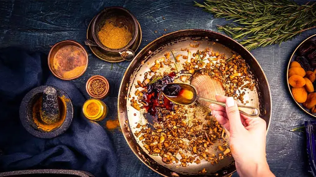 Un plato de inspiración de Oriente Medio que combina matices dulces y salados: cordero braseado y marinado con Salsa de Soja Naturalmente Fermentada Kikkoman, jengibre y cúrcuma, luego cocido a fuego lento con ciruelas pasas, dátiles y albaricoques. Una creación llena de carácter, perfecta para una cena especial.