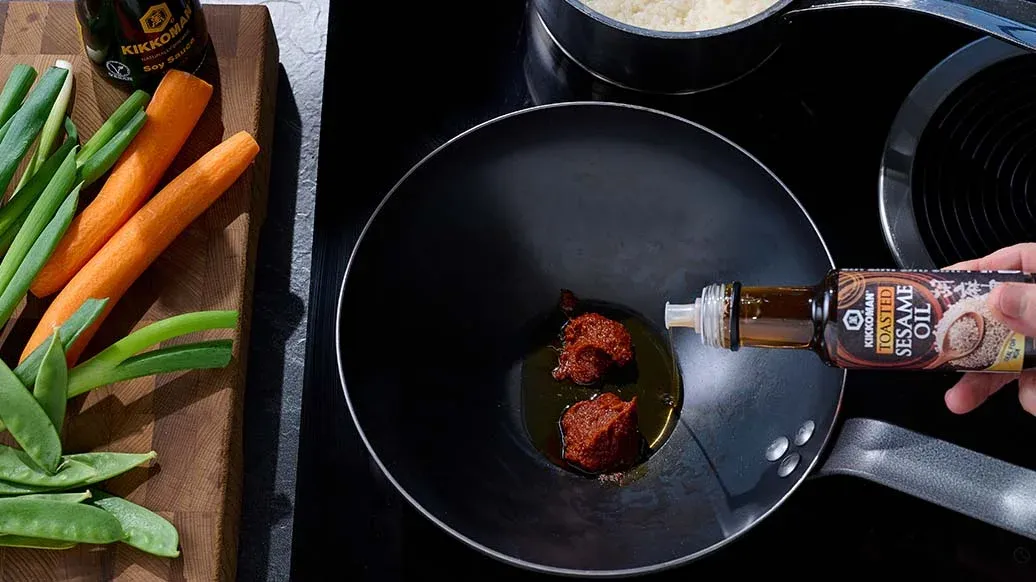 Cueza el arroz siguiendo las indicaciones del paquete. Corte el pollo en trozos, los pimientos en tiras, las cebolletas en aros, las zanahorias en rodajas finas y parta los tirabeques por la mitad. En un wok, saltee la pasta de curry en el Aceite de Sésamo Tostado Kikkoman caliente durante unos instantes para intensificar su aroma. Añada la leche de coco, unos 100 ml de agua y la Salsa de Soja Naturalmente Fermentada Kikkoman, y lleve a ebullición.