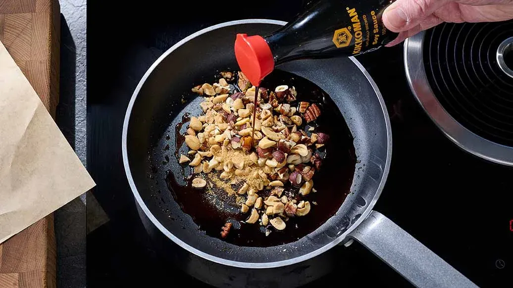 Pique groseramente los frutos secos. En una sartén, caliente la Salsa de Soja Naturalmente Fermentada Kikkoman junto con el azúcar hasta que comience a burbujear. Añada los frutos secos y remueva hasta que queden bien glaseados. Extiéndalos sobre papel de horno y deje que se enfríen por completo.