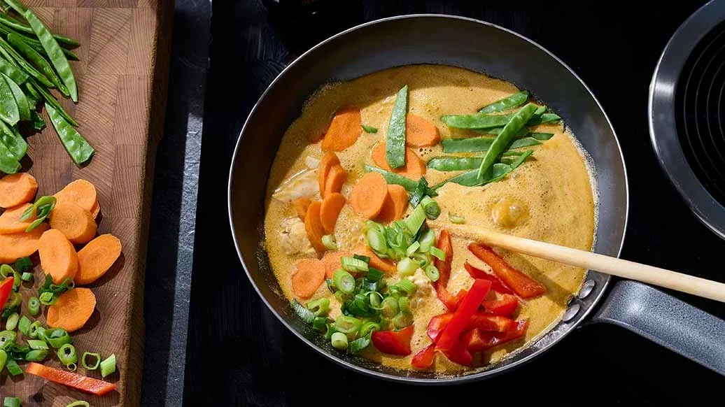 Un clásico tailandés muy apreciado, lleno de verduras crujientes, pollo tierno y una salsa cremosa de coco con todo el sabor. Aromatizado con pasta de curry rojo y Salsa de Soja Kikkoman, ofrece un equilibrio perfecto entre intensidad y suavidad.