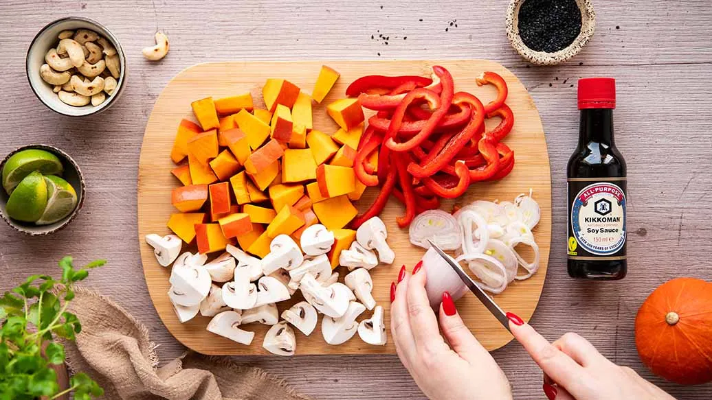 En un cazo, caliente el aceite de colza y saltee las chalotas durante unos instantes. Añada la calabaza, las setas y el pimiento rojo, y cocine hasta que estén ligeramente tiernos. Incorpore la pasta de curry y sofríala alrededor de 1 minuto. Agregue el caldo, la leche de coco y la Salsa de Soja Naturalmente Fermentada Kikkoman, junto con la mantequilla de cacahuete. Cocine hasta que las verduras estén hechas. Añada las espinacas y el zumo de media lima, y caliente suavemente.