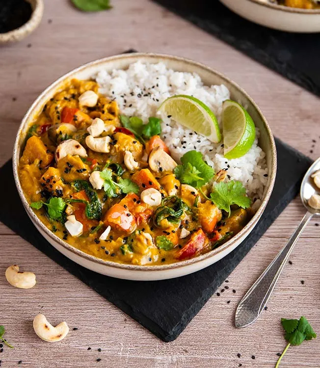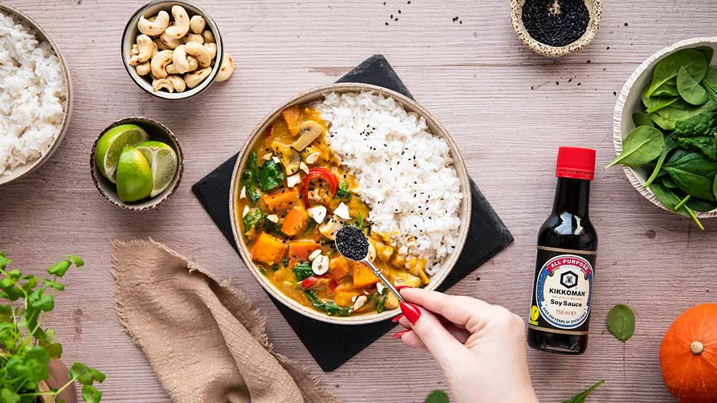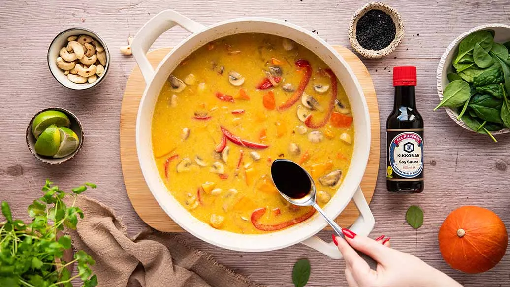 Curry verde vegano suave con calabaza, espinacas y setas. La leche de coco le aporta cremosidad, mientras que la Salsa de Soja Kikkoman añade profundidad umami. Ligero, pero satisfactorio y fácil de preparar.