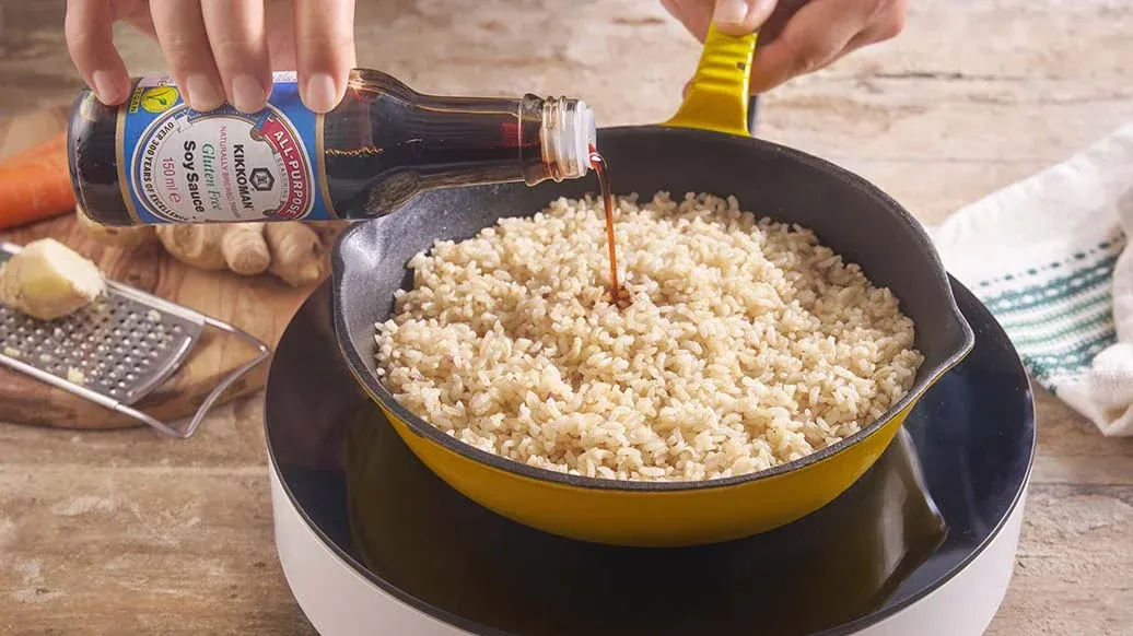 100 g de arroz integral (por ejemplo, Sona Masoori) – 30 g de mantequilla clarificada (ghee) – 30 g de chalota, picada – 2 dientes de ajo, picados – 1 cucharada Kikkoman Salsa de Soja Tamari naturalmente fermentada Sin Gluten – 1 guindilla verde, en rodajas