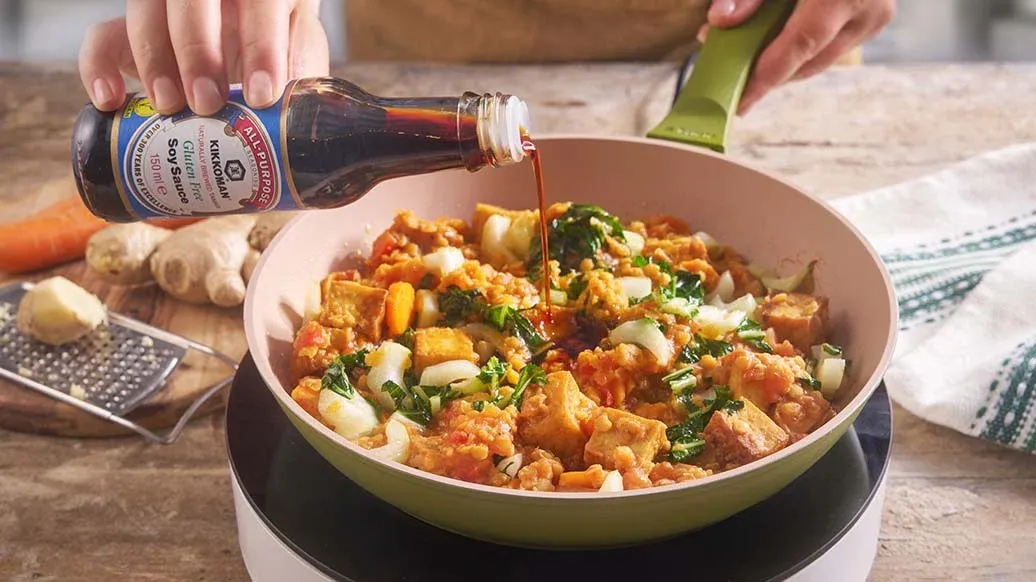 En la misma sartén del paso anterior, incorpore el pak choi y saltéelo durante 1–2 minutos. Añada el garam masala y sofría durante 10–15 segundos para que libere su aroma. Agregue las lentejas ya cocidas, incorpore los tomates en conserva y deje cocinar otros 3 minutos. Sazone con la Salsa de Soja Tamari sin gluten Naturalmente Fermentada Kikkoman y el Aceite de Sésamo Tostado Kikkoman.