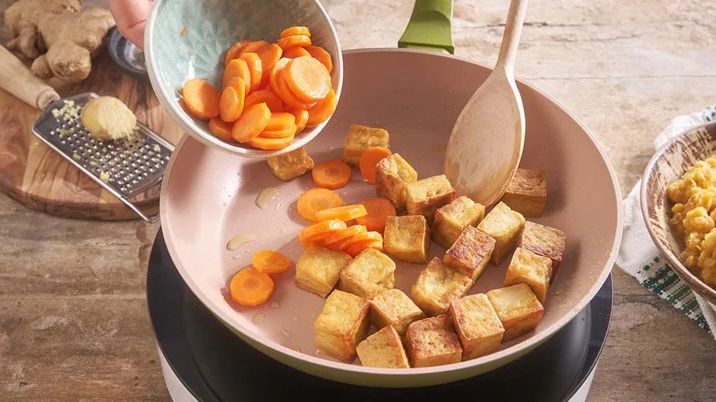 Cueza las lentejas en el caldo de verduras durante 10 minutos. En una sartén, fría el tofu en el ghee durante unos 4–5 minutos, hasta que esté crujiente. Añada la zanahoria y el jengibre, y saltee durante 2 minutos.