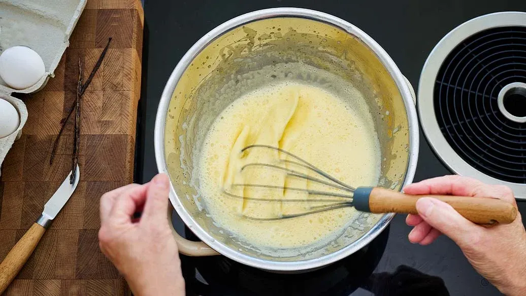 1 vaina de vainilla – 3 yemas de huevo – 8 g de azúcar avainillado – 1 cucharada de azúcar – 125 ml de nata doble – 1 ramita de menta