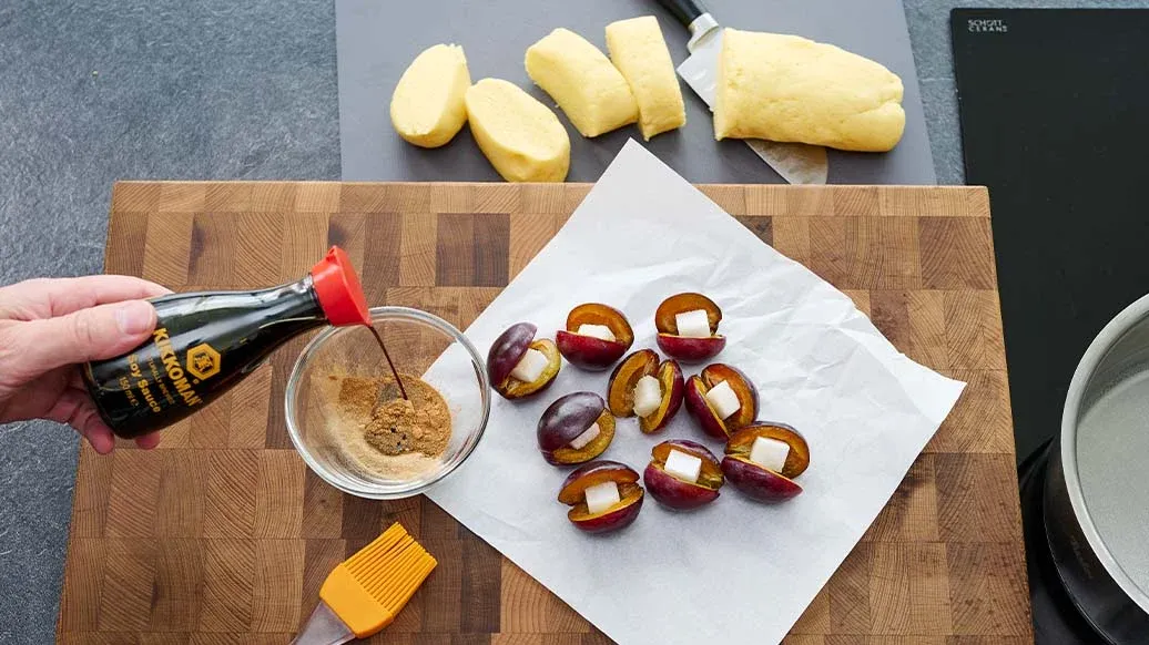 Haga un corte en las ciruelas claudias y retíreles el hueso, colocando un terrón de azúcar dentro de cada una. Mezcle la canela, el cardamomo y la Salsa de Soja Naturalmente Fermentada Kikkoman. Unte las ciruelas con esta preparación. Ponga a hervir una cacerola grande con agua y sal. Sobre una superficie enharinada, forme un rulo con la masa de patata de unos 5 cm de grosor. Córtelo en 8 porciones y aplánelas ligeramente. Coloque una ciruela en el centro de cada porción, cierre la masa y deles forma de dumpling. Cuézalos en el agua hirviendo a fuego suave durante 10–15 minutos, hasta que estén hechos.