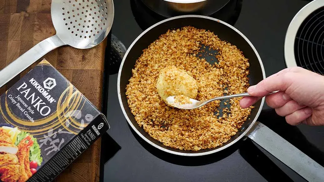 Derrita la mantequilla en una sartén grande y tueste el Panko - Pan rallado crujiente estilo japonés Kikkoman hasta que adquiera un tono dorado. Saque los dumplings del agua con una espumadera, escúrralos bien y rebócelos en las migas con mantequilla.