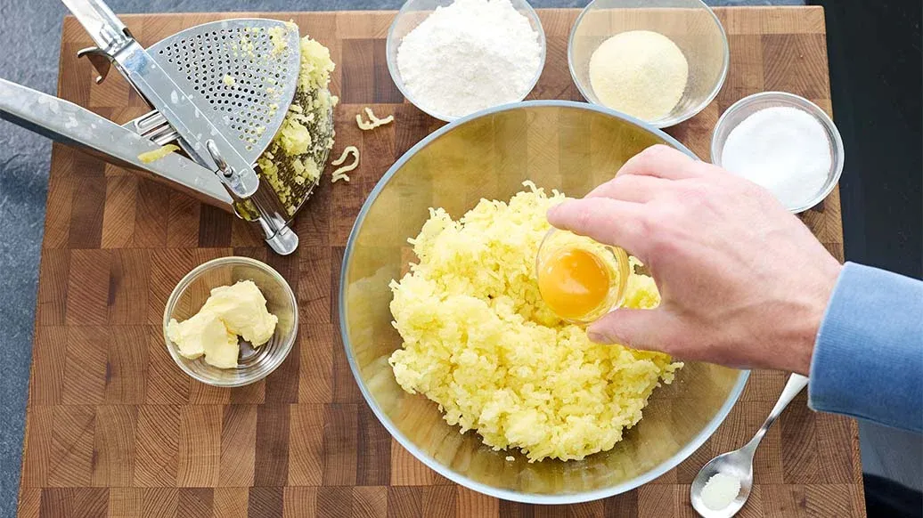 400 g de patatas harinosas – 100 g de harina de trigo – 25 g de sémola – 20 g de mantequilla blanda – 1 yema de huevo – 50 g de azúcar – ½ cucharadita de sal