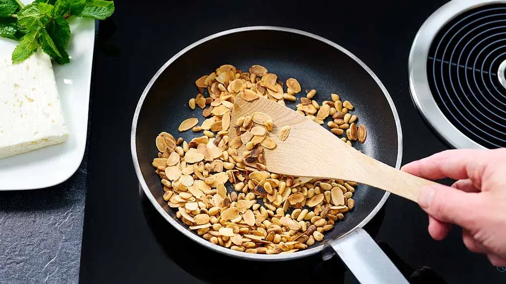 Dore las almendras laminadas y los piñones en una sartén antiadherente a fuego medio durante unos 3 minutos, hasta que estén dorados y fragantes. Desmenuce el queso feta con las manos.