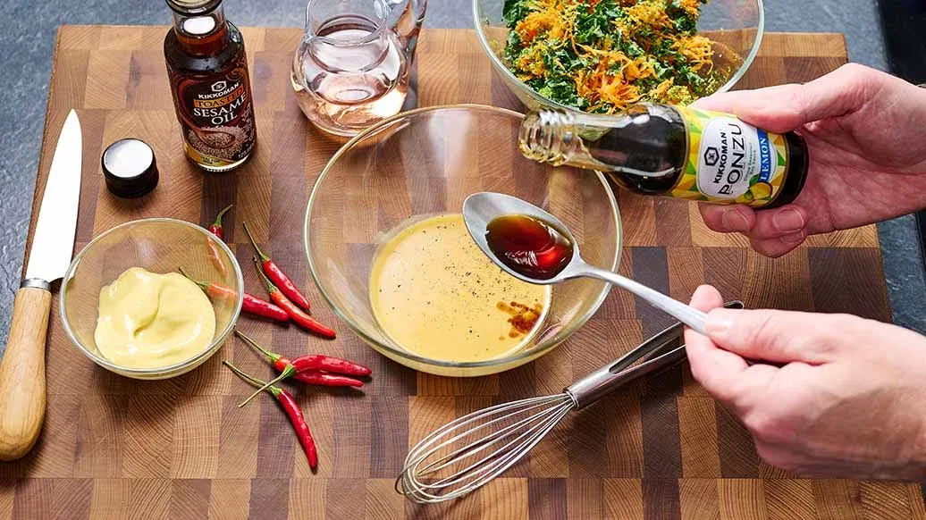 Elabore el aliño picando finamente la guindilla y emulsionándola con la Salsa Ponzu Limón Kikkoman, el Aceite de Sésamo Tostado Kikkoman, el vinagre de vino tinto, la mostaza de Dijon y el sirope de agave. Ajuste con pimienta recién molida. Incorpore esta mezcla al kale, el brócoli y las zanahorias.
