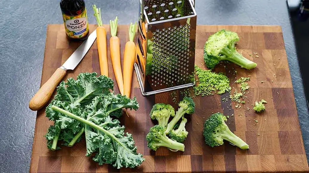 Corte el kale en tiras finas. Ralle el brócoli y las zanahorias muy finamente.