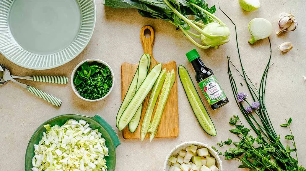 Corte la col china en tiras finas y el colinabo en dados. Retire las semillas del pepino y resérvelas. Corte el resto del pepino en rodajas. Mezcle las verduras con el cebollino picado y las hojas de menta.