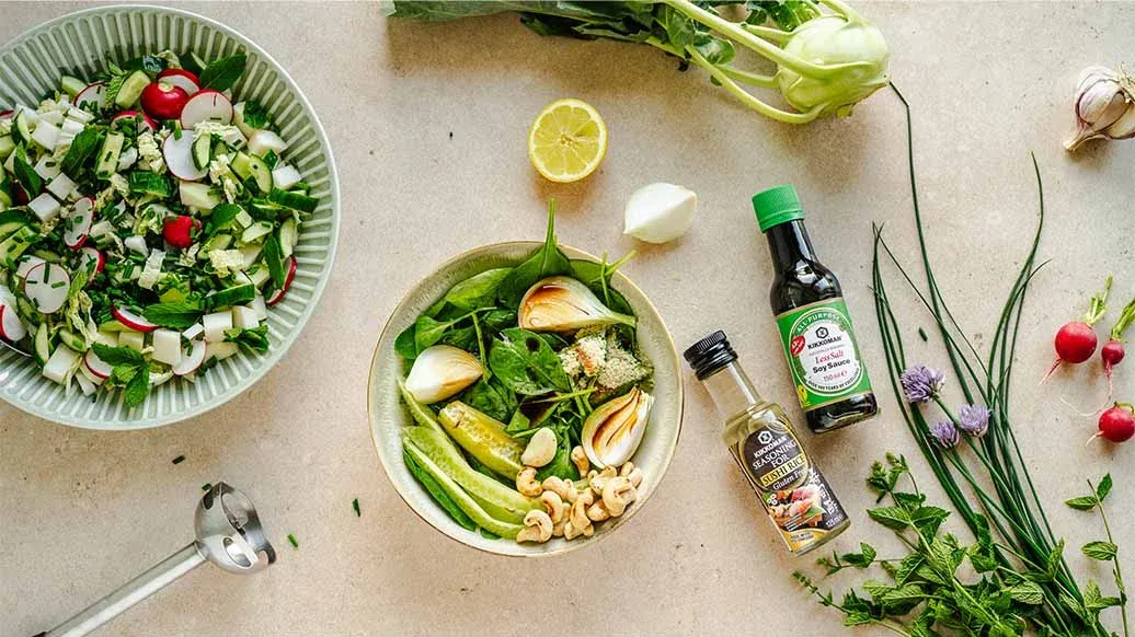 Triture las espinacas, la cebolla, el ajo y las semillas de pepino reservadas hasta obtener una salsa homogénea, junto con el aceite de oliva, la Salsa de Soja con menos sal Naturalmente Fermentada Kikkoman, el Sazonador para arroz de sushi Kikkoman, el zumo de limón, los copos de levadura nutricional y los anacardos. Vierta el aliño sobre las verduras y mezcle bien.