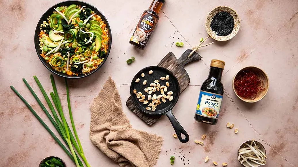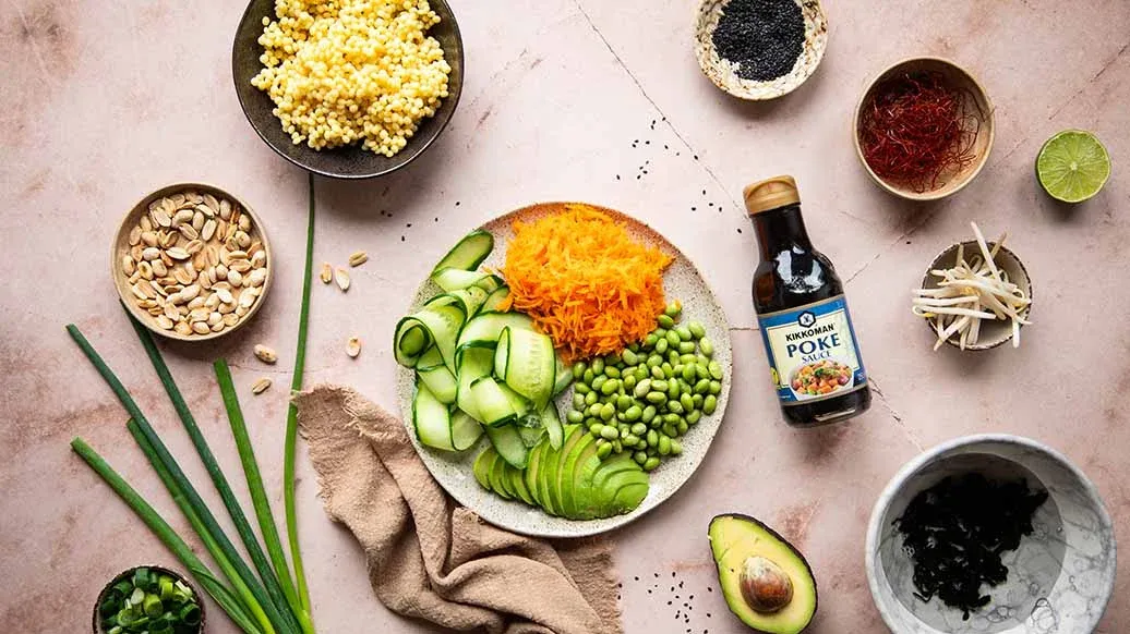 Una ensalada fresca que une cuscús, verduras jugosas, aguacate y edamame con la suavidad del alga wakame. El aliño de miel y lima, realzado con Salsa para Poke Bowl Kikkoman, aporta un toque vibrante, mientras los cacahuetes, los brotes y el sésamo negro intensifican el sabor y la textura.