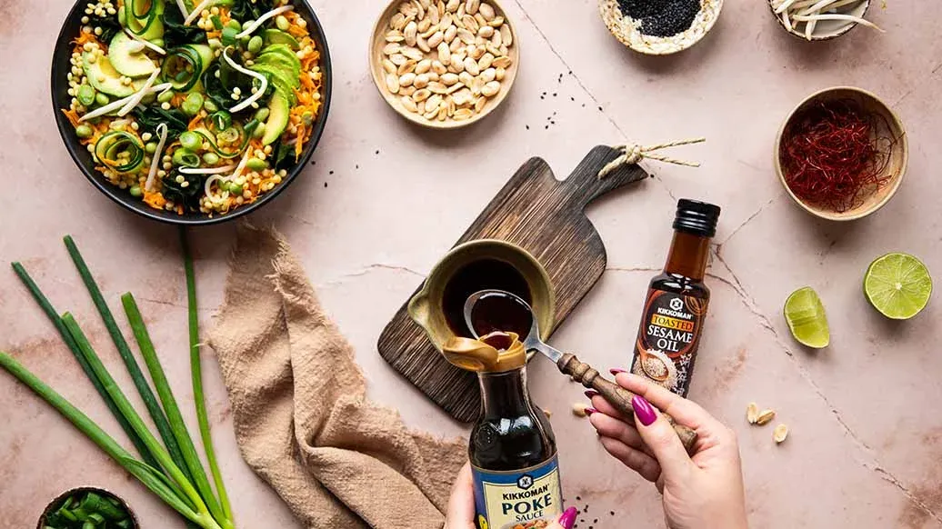 En un cuenco pequeño, mezcle la Salsa para Poke Bowl Kikkoman, ½ cucharada de zumo de lima, el Aceite de Sésamo Tostado Kikkoman y la miel. Vierta el aliño sobre la ensalada y mézclela para que se impregne bien.