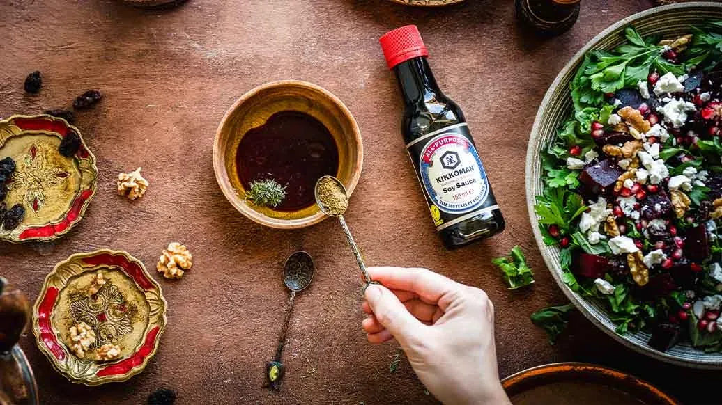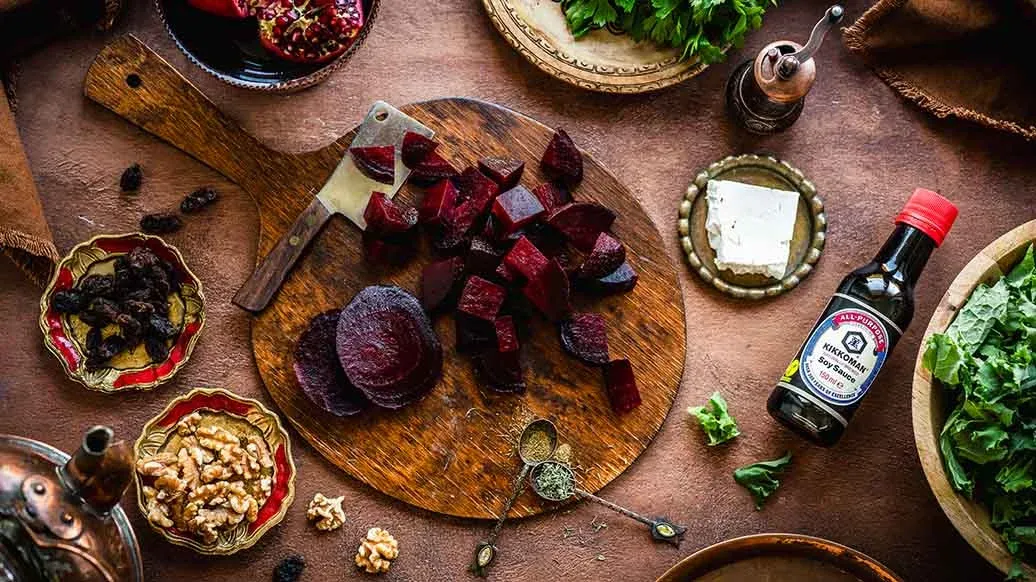 Inspirada en los sabores de Oriente Medio, esta ensalada combina kale y remolacha asada con la dulzura de las pasas y el frescor de la granada. El conjunto se realza con nueces crujientes, queso feta y un aromático aliño de tomillo y Salsa de Soja Naturalmente Fermentada Kikkoman, creando un contraste equilibrado y festivo.