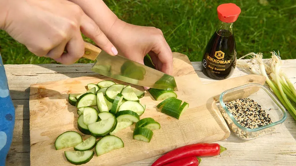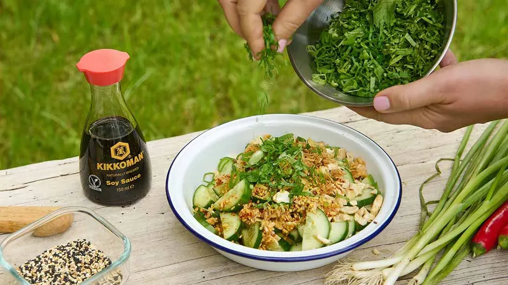 Una refrescante ensalada de pepino con crujientes nueces, chile picante y la sabrosa Salsa de Soja Kikkoman, aderezada con cebollas asadas para añadir textura y sabor.