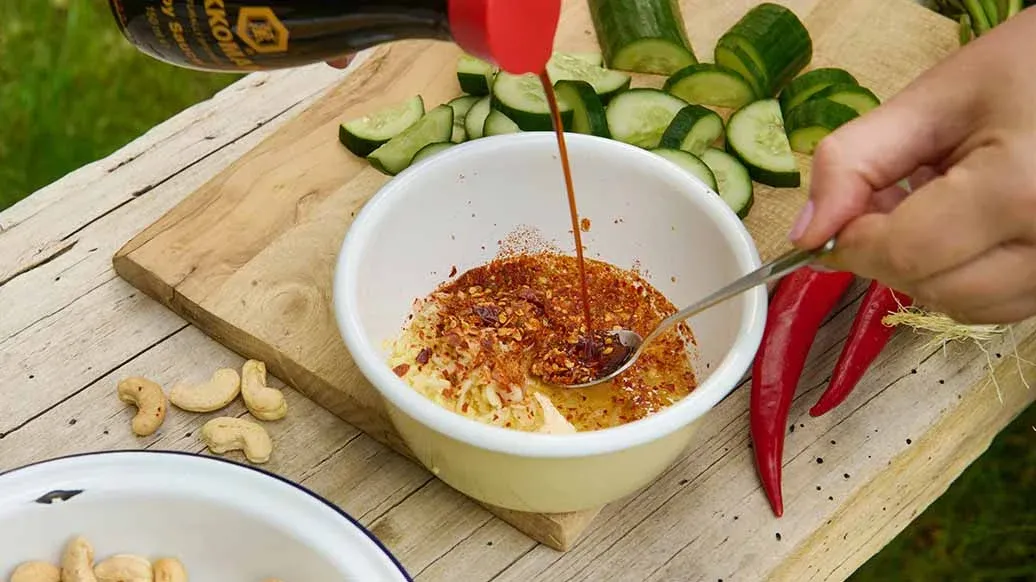 Pique finamente el ajo, el jengibre y los anacardos, y mézclelos en un bol. Añada los copos de guindilla, la Salsa de Soja Kikkoman, el vinagre, la miel y el Aceite de Sésamo Kikkoman e integrélos bien. Sazone con sal y pimienta al gusto. Mezcle los pepinos con el aliño.