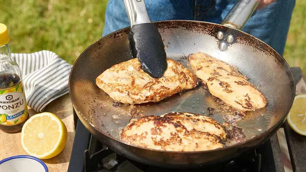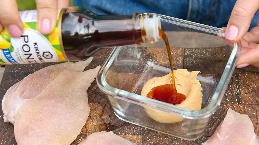 300 g de filete de pollo – 1 pellizco de pimienta recién molida – 1 cucharada de mantequilla de cacahuete – 90 ml Kikkoman Ponzu - Aderezo con Salsa de Soja y Vinagre, con Sabor a Limón