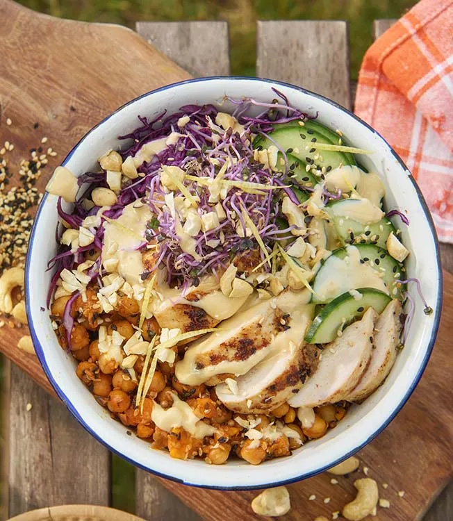 Un toque vibrante a la ensalada clásica: pollo marinado en cacahuete acompañado de crujiente col lombarda, anacardos cremosos y el aliño del Ponzu Limón Kikkoman; junto a los garbanzos crujientes y el perejil aromático forman una explosión de textura y frescura.