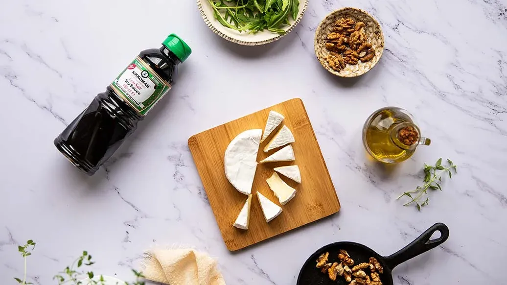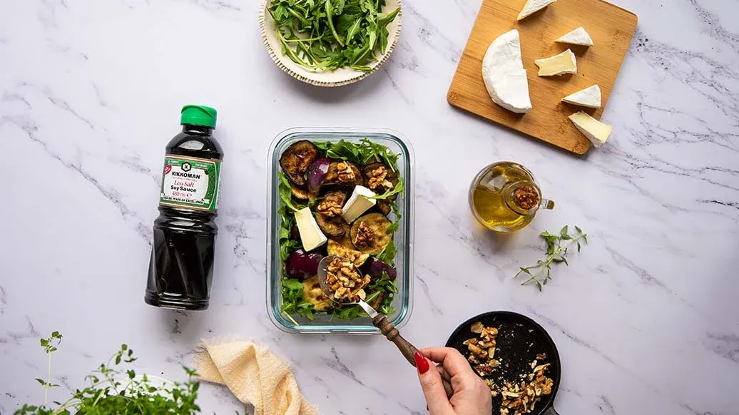 Calabacín y berenjena a la parrilla, queso camembert cremoso y nueces tostadas, juntos en una ensalada que se eleva con un aliño sabroso elaborado con Salsa de Soja Kikkoman.