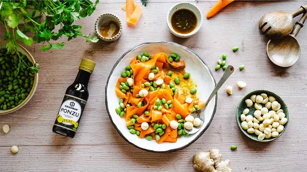 Una ensalada fresca y crujiente de zanahoria y jengibre, realzada con el matiz cítrico de la Salsa Ponzu Yuzu Kikkoman. Las nueces de macadamia y el edamame completan el plato con textura y nutrientes. Ideal como aperitivo ligero o acompañamiento para recetas de estilo asiático.